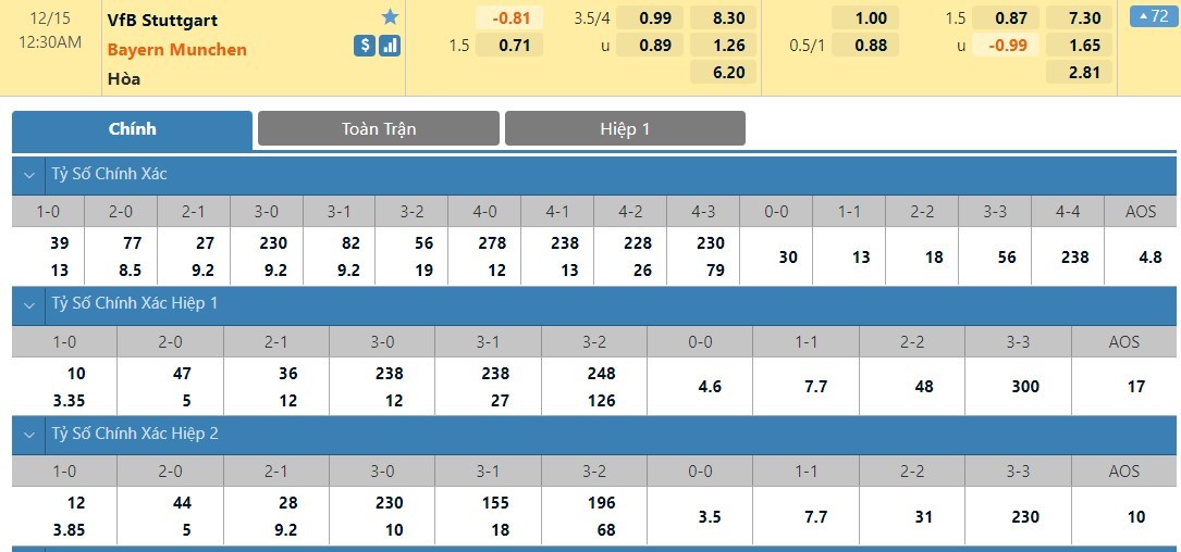Tip kèo tỷ số hiệp 1: Stuttgart 0-2 Bayern Munich