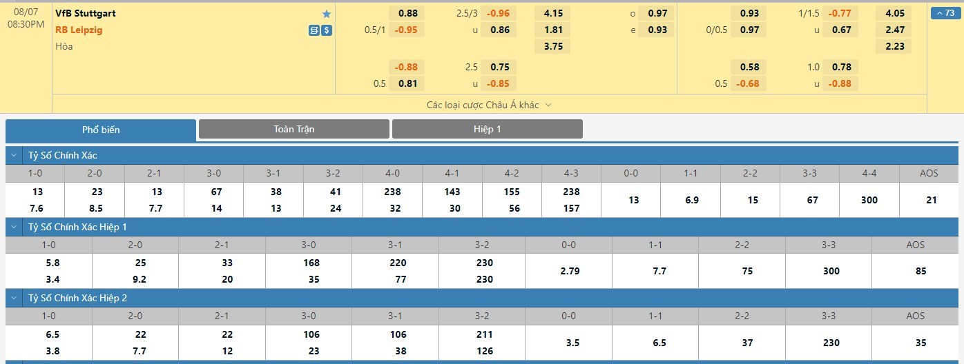 Nếu như Stuttgart đã có được cho mình 3/5 trận đấu gần nhất mang về 1 bàn thắng trong hiệp đấu đầu tiên thì RB Leipzig đã có 1 lần làm được điều này. Khả năng nhập cuộc đầu trận của RB Leipzig là không thật sự thuyết phục. Do đó, với tỷ lệ kèo hiệp 1 là đội khách chấp -1/4 trái thì người chơi nên tin tưởng vào đội chủ nhà để mang về cơ hội thắng cao hơn.