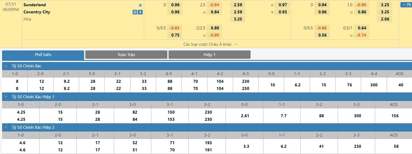 Nếu như Sunderland đã có được cho mình 2/5 trận đấu gần nhất mang về 1 bàn thắng trong hiệp đấu đầu tiên thì Coventry cũng đã có 2 lần làm được điều này. Với kèo hiệp 1 thì người chơi nên tin tưởng vào kết quả Hòa. Người chơi nên cân nhắc lựa chọn ô cược Coventry được hưởng tỷ lệ chấp +1/4 trái để mang về cơ hội thắng cao hơn.