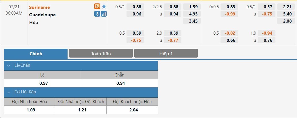 Tip kèo tỷ số hiệp 1: Suriname 1-0 Guadeloupe