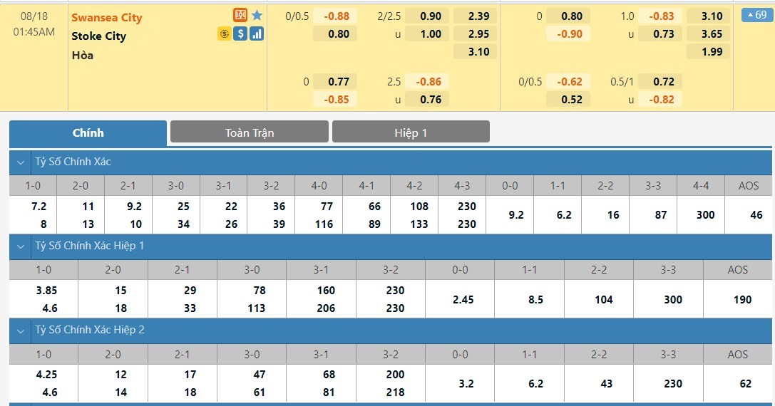 Tip kèo tỷ số hiệp 1: Swansea City 0-0 Stoke City