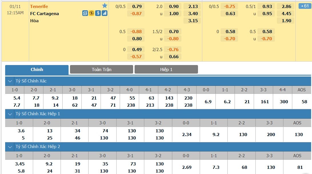 Tip kèo tỷ số hiệp 1: Tenerife 0-0 Cartagena