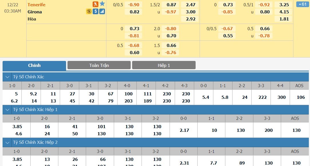 Tip kèo tỷ số hiệp 1: Tenerife 0-0 Girona