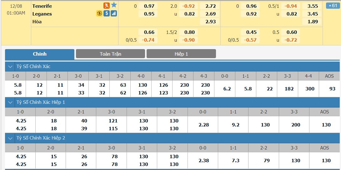 Tip kèo tỷ số hiệp 1: Tenerife 0-0 Leganes
