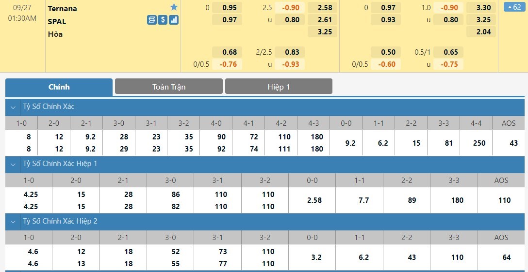 Tip kèo tỷ số hiệp 1: Ternana 0-0 SPAL 2013