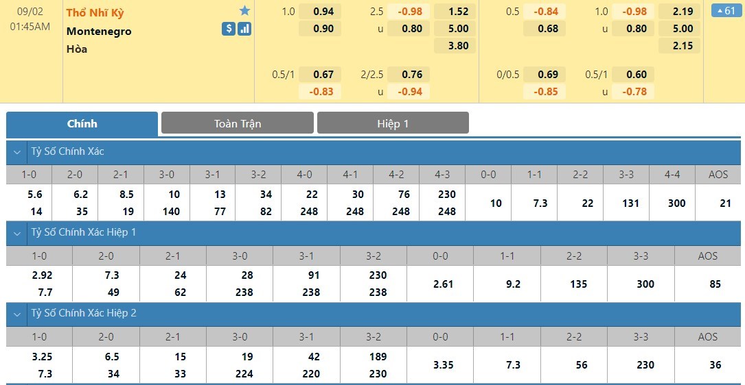 Thổ Nhĩ Kỳ nhận được đánh giá cao từ phía nhà cái với mốc chấp -1. Cũng dễ lý giải khi mà họ vừa nắm giữ lợi thế sân bãi lại còn sở hữu dàn cầu thủ chất lượng đồng đều hơn so với vị khách Montenegro. Trong 2 lần chạm trán gần nhất giữa hai đội, Thổ Nhĩ Kỳ có được 1 chiến thắng và 1 trận hòa.