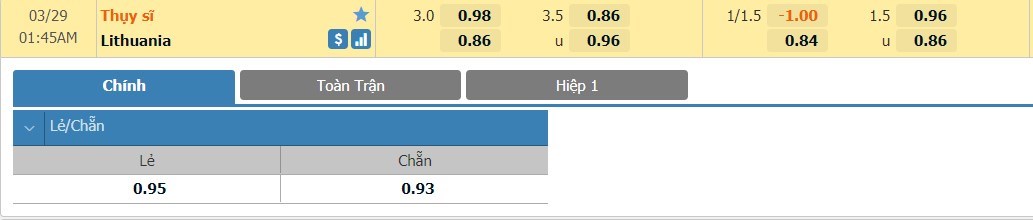 Tip kèo tỷ số hiệp 1: Thụy Sĩ 2-0 Lithuania