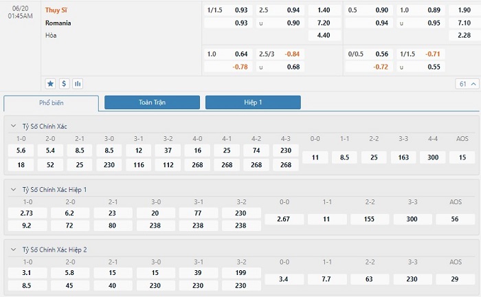 Tip kèo tỷ số hiệp 1: Thụy Sĩ 2-0 Romania