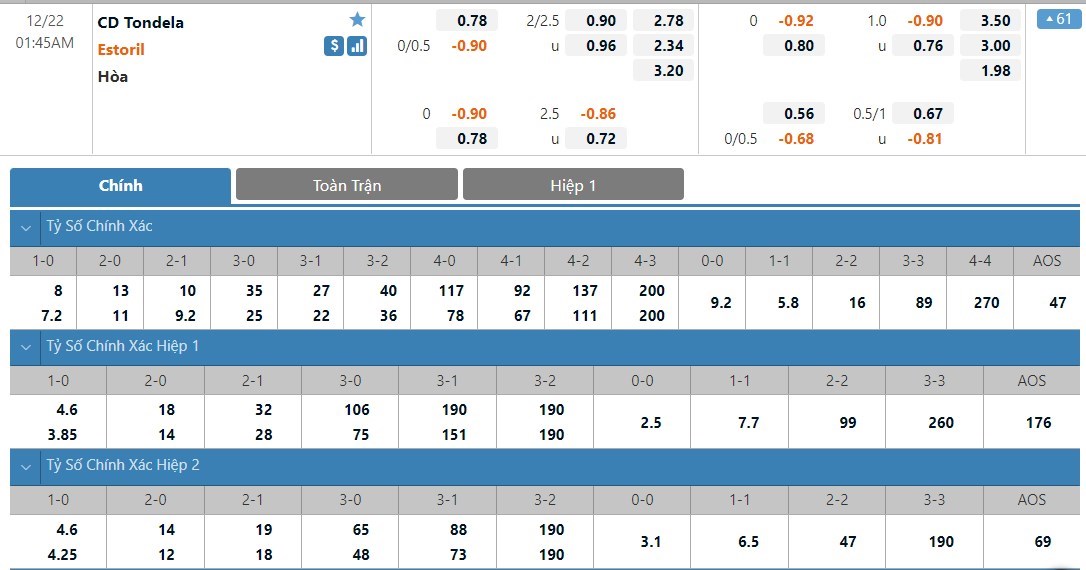Sự áp đảo được thể hiện quá rõ thông qua những lần chạm trán trước đây giữa hai đội. Xét trong 8 màn so tài gần nhất, Tondela hoàn toàn lép vế khi đội bóng nàu chỉ may mắn tìm kiếm được 1 kết quả hòa, còn lại là 7 chiến thắng dành cho Estoril. Chẳng cần nói đâu xa, hồi giữa tháng 9 năm nay chứng kiến Estoril đã vượt qua Tondela ngay trên chính sân đối thủ với tỷ số 2-1. Thống kê 3/4 cuộc đối đầu gần nhất giữa hai đội bóng này xuất hiện từ 3 bàn trở lên. Với kèo tài xỉu 2 1/4 trái nhà cái đưa ra thì người chơi có thể mạnh dạn đặt cược vào cửa tài.