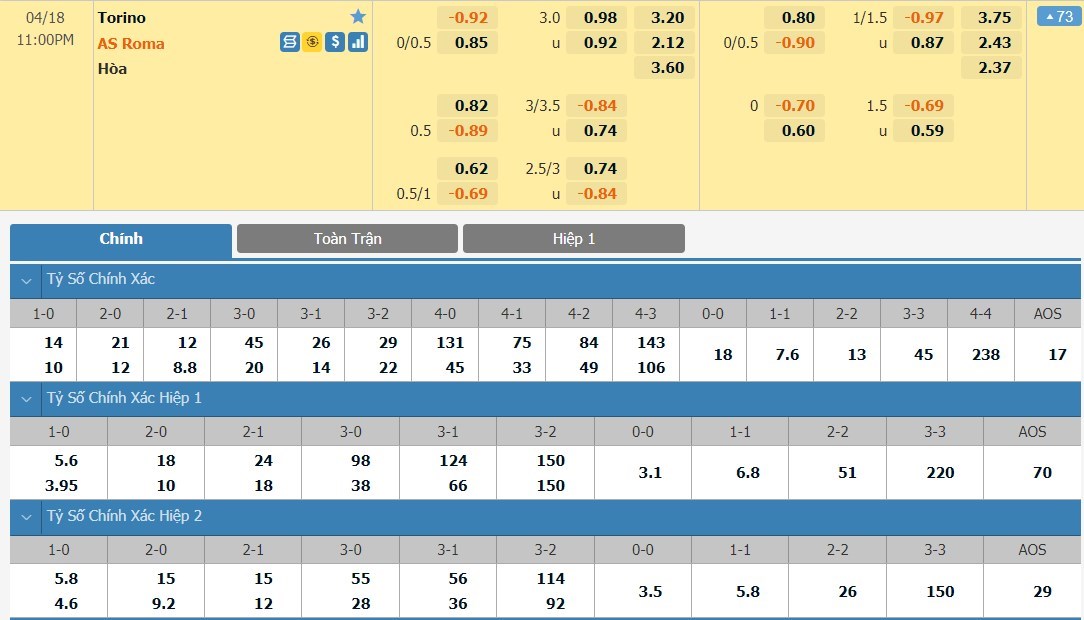 Về đẳng cấp và phong độ của hai đội, chắc chắn AS Roma được đánh giá cao hơn so với đối thủ. Tỷ lệ kèo chấp trong hiệp 1 nghiêng về phía đội khách và kèo chấp cả trận cũng là -1/4 trái. Nhiều khả năng, AS Roma sẽ không chơi tấn công dồn dập nhưng sẽ tận dụng những pha lên bóng để ghi bàn. Torino nếu chọn lối chơi phòng ngự phản công sẽ cần đảm bảo được sự chắc chắn bên phần sân nhà. Bài tấn công tận dụng chiều cao của tiền đạo Edin Dzeko nhiều khả năng sẽ phát huy tác dụng trong trận đấu này.