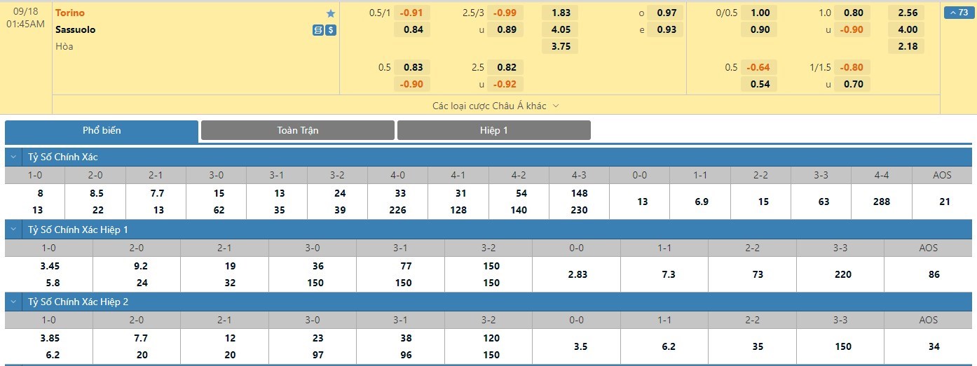 Trong 5 trận đấu gần nhất, Torino đã có 2 trận đấu mang về được cho mình ít nhất là 1 bàn thắng trong hiệp đấu đầu tiên. Còn với Sassuolo, đội bóng này đã có 3 lần chọc thủng lưới đối phương trong 45 phút đầu tiên. Với tỷ lệ kèo hiệp 1 ở trận đấu này được đưa ra là Torino -1/4 trái thì người chơi nên tin tưởng vào đội khách trận này.