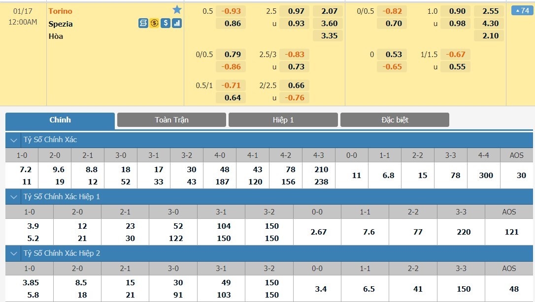 Tip kèo tỷ số hiệp 1: Torino 0-0 Spezia