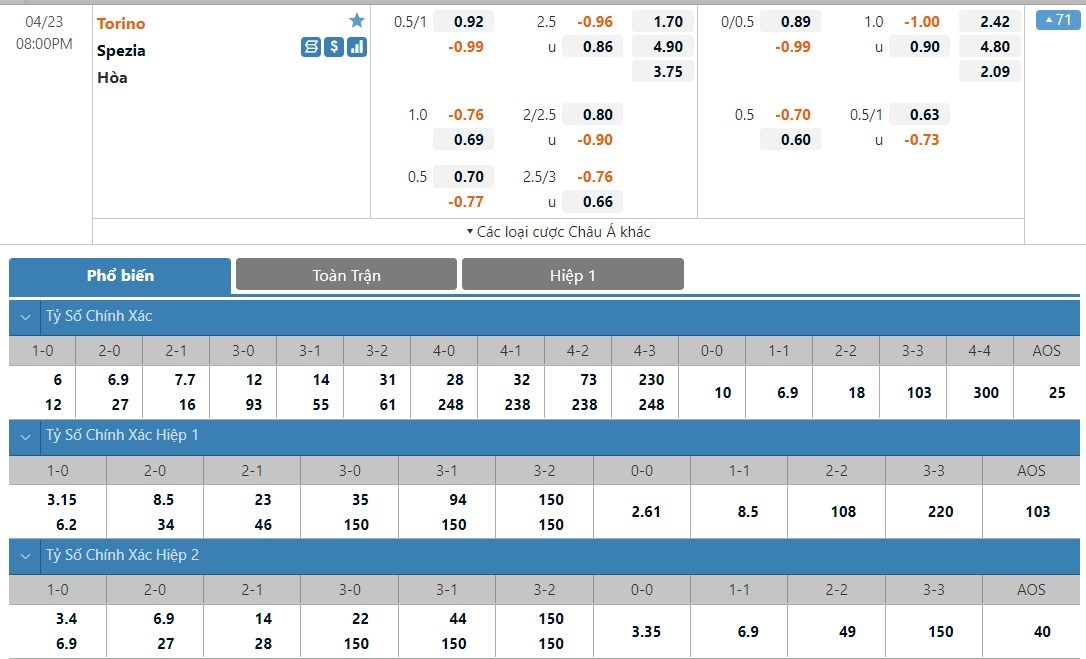 Tip kèo tỷ số hiệp 1: Torino 0-0 Spezia