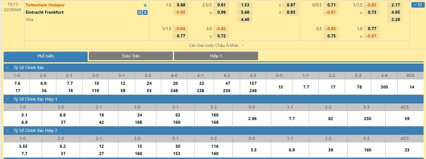 Tip kèo tỷ số hiệp 1: Tottenham 0-0 Eintracht Frankfurt