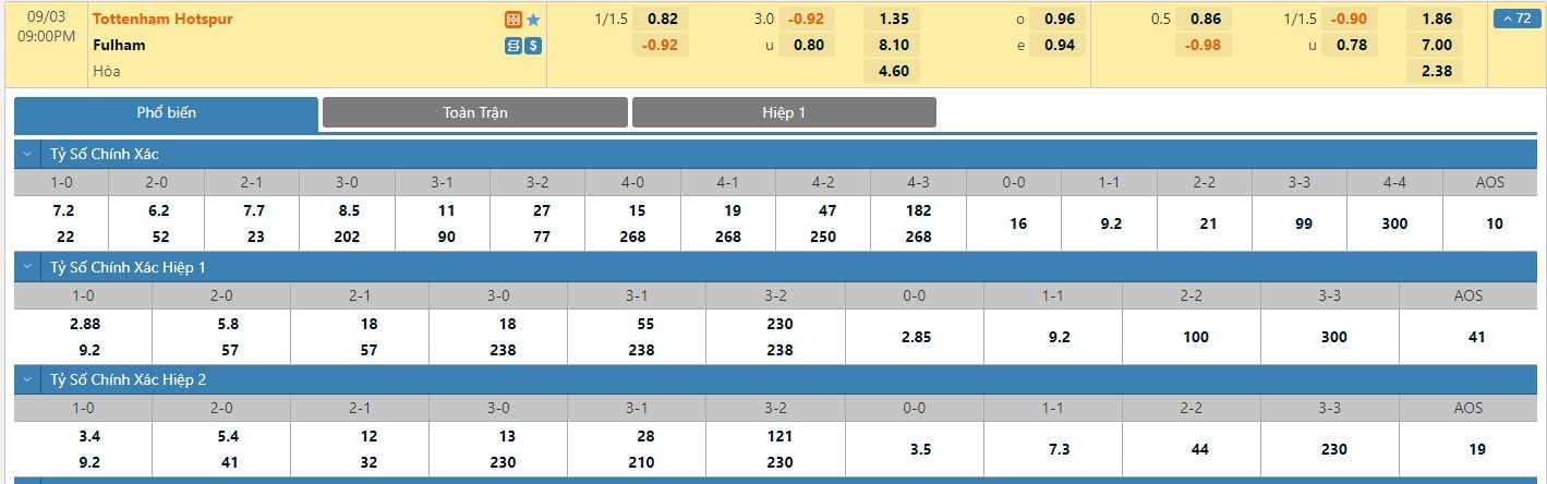 Trong 5 trận đấu gần nhất, Tottenham đã có 2 trận đấu mang về được cho mình ít nhất là 1 bàn thắng trong hiệp đấu đầu tiên. Còn Fulham chỉ có 1 lần làm được điều này. Với tỷ lệ kèo hiệp 1 ở trận đấu này được đưa ra là -1/2 trái và người chơi nên tin tưởng vào đội chủ nhà.