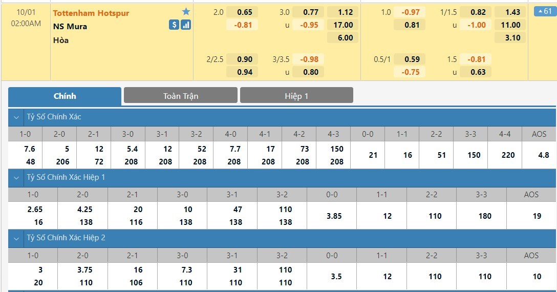 Tip kèo tỷ số hiệp 1: Tottenham 2-0 Mura