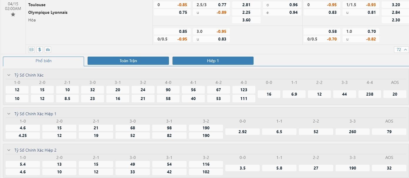 Trong 5 trận đấu gần nhất hai đội bóng này đối đầu nhau trực tiếp, Toulouse đã có 2 trận đấu nào mang về được cho mình ít nhất là 1 bàn thắng trong hiệp đấu đầu tiên. Còn với Lyon, đội bóng này đã có cả 5 lần làm được điều này trong 45 phút đầu tiên. Khả năng nhập cuộc đầu trận ấn tượng khi chạm mặt Toulouse sẽ là điểm tựa để Lyon thêm phần tự tin hướng đến một kết quả tốt trên sân đối phương. Với tỷ lệ kèo hiệp 1 là đồng banh thì người chơi nên tin tưởng vào đội khách trận này. Trong 5 trận đấu gần nhất hai đội bóng này đối đầu nhau trực tiếp thì đã có 4 trận đấu kết thúc với tổng số bàn thắng từ 3 trên lên. Các nhà đầu tư nên tin tưởng vào khả năng nổ Tài ở cuộc đối đầu này với tỷ lệ tài xỉu là 2 3/4 trái.