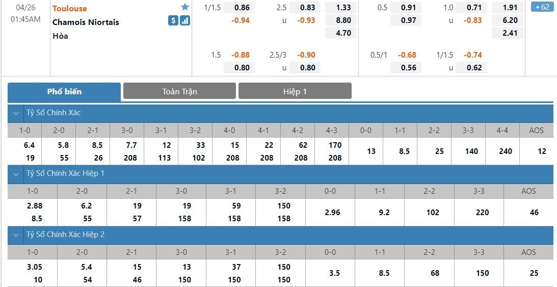 Tip kèo tỷ số hiệp 1: Toulouse 1-0 Niort