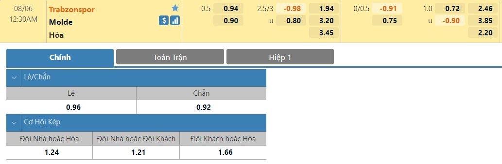 Tip kèo tỷ số hiệp 1: Trabzonspor 2-0 Molde