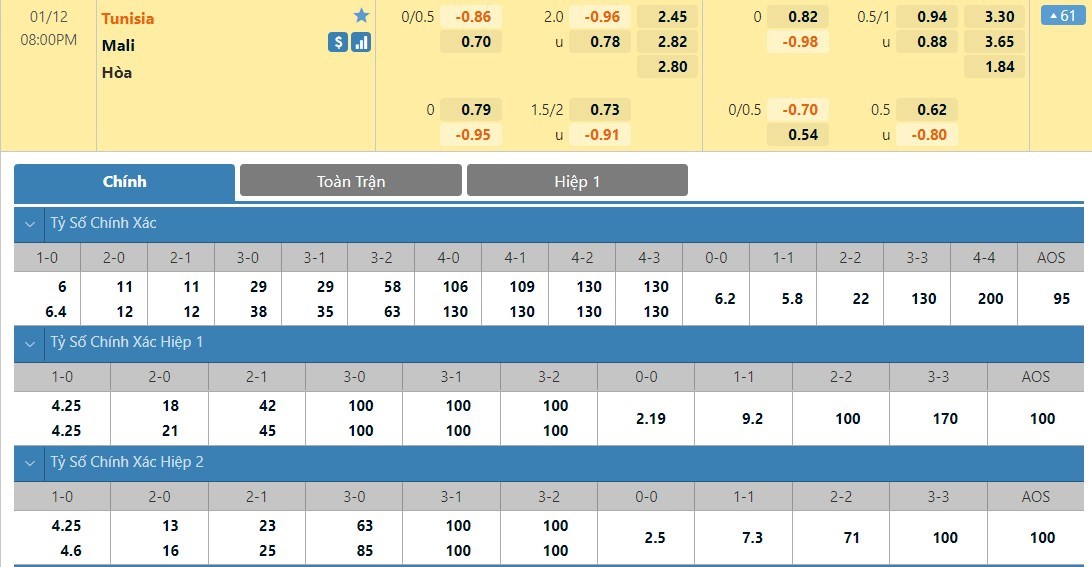 Tip kèo tỷ số hiệp 1: Tunisia 0-0 Mali