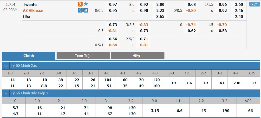 Tip kèo tỷ số hiệp 1: Twente 0-0 AZ Alkmaar