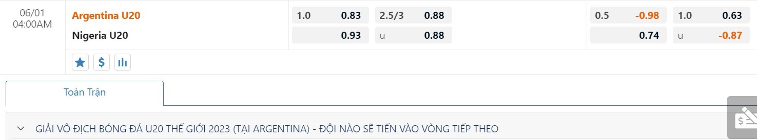 Tip kèo tỷ số hiệp 1: U20 Argentina 2-0 U20 Nigeria