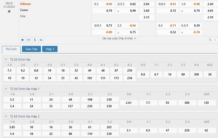 Tip kèo tỷ số hiệp 1: Udinese 1-0 Como
