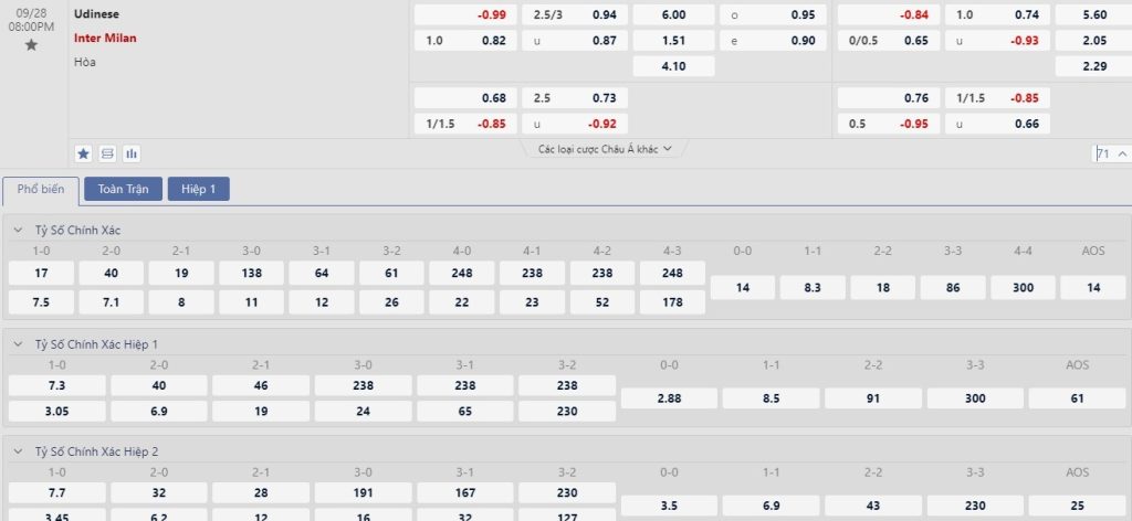 Tip kèo tỷ số hiệp 1: Udinese 0-0 Inter Milan