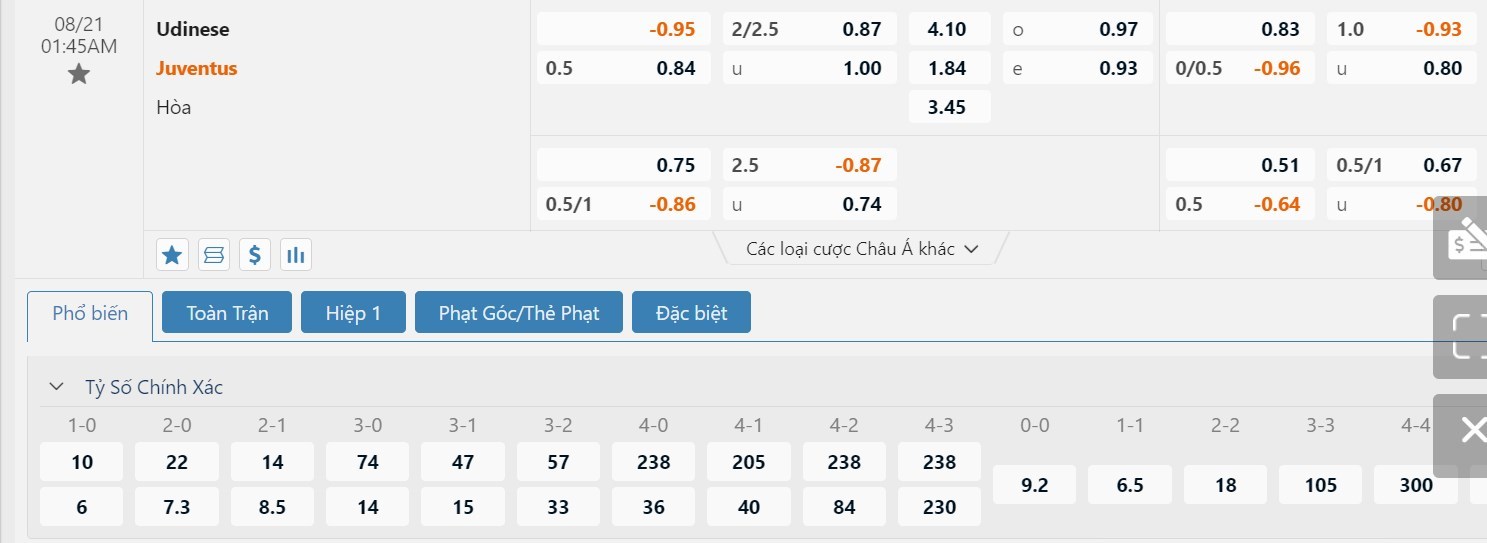 Trong 5 trận đấu gần nhất trên mọi đấu trường, Udinese đã mang về cho mình 10 pha lập công cùng với 4 lần phải vào lưới nhặt bóng. Bên kia chiến tuyến, Juventus đã sở hữu 6 bàn thắng, còn lại là việc hàng thủ đã phải nhận 4 bàn thua. Các nhà đầu tư nên tin tưởng vào khả năng nổ Tài ở cuộc đối đầu này với tỷ lệ tài xỉu là 2 1/4 trái.