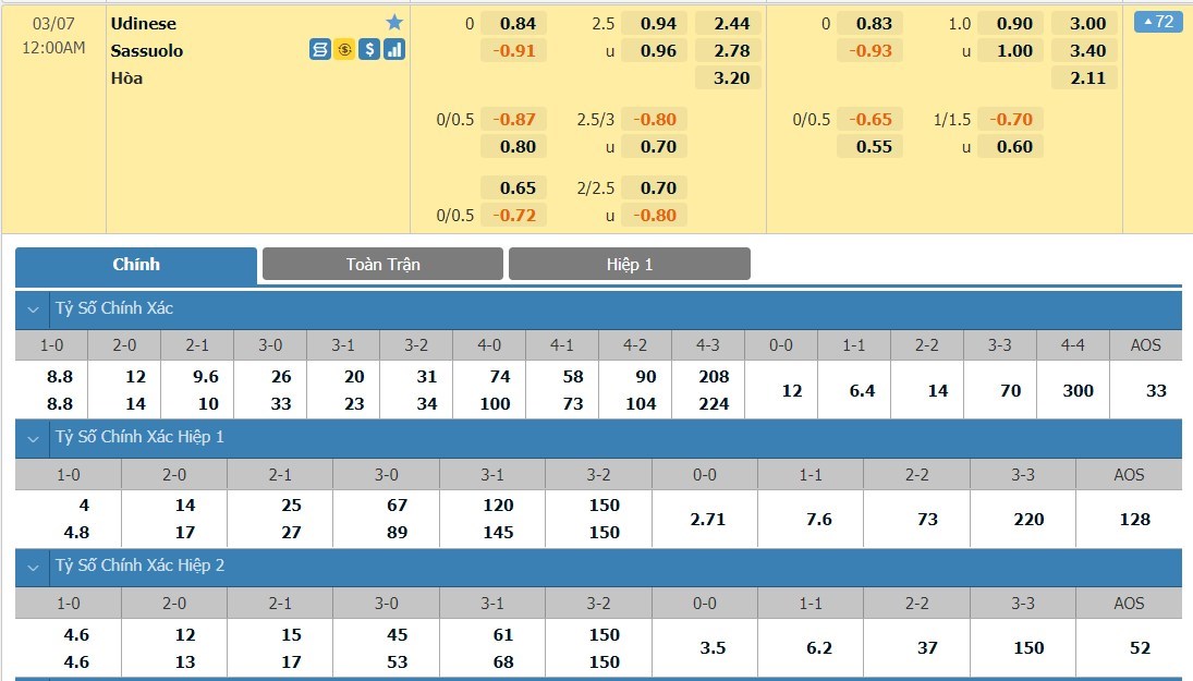 Tip kèo tỷ số hiệp 1: Udinese 0-0 Sassuolo