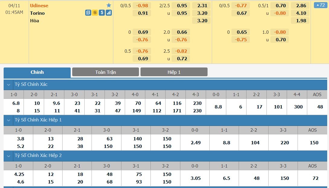 Tip kèo tỷ số hiệp 1: Udinese 0-0 Torino
