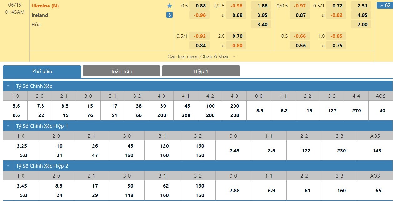 Tip kèo tỷ số hiệp 1: Ukraine 0-0 Ireland
