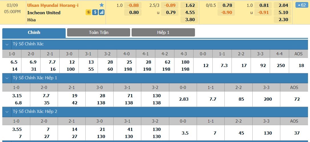Tip kèo tỷ số hiệp 1: Ulsan Hyundai 2-0 Incheon United