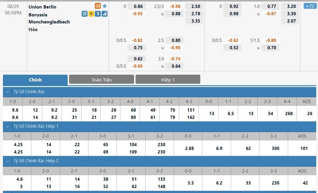 Tip kèo tỷ số hiệp 1: Union Berlin 1-1 Borussia M.Gladbach