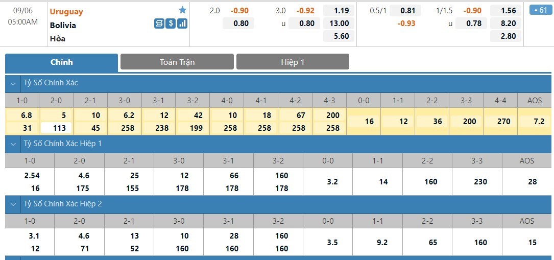 Tip kèo tỷ số hiệp 1: Uruguay 2-0 Bolivia
