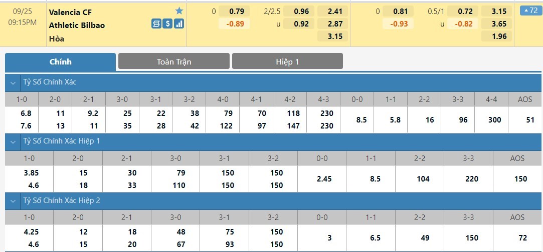 Tip kèo tỷ số hiệp 1: Valencia 0-0 Athletic Bilbao