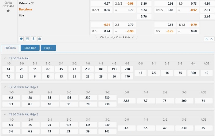 Tip kèo tỷ số hiệp 1: Valencia 0-1 Barcelona