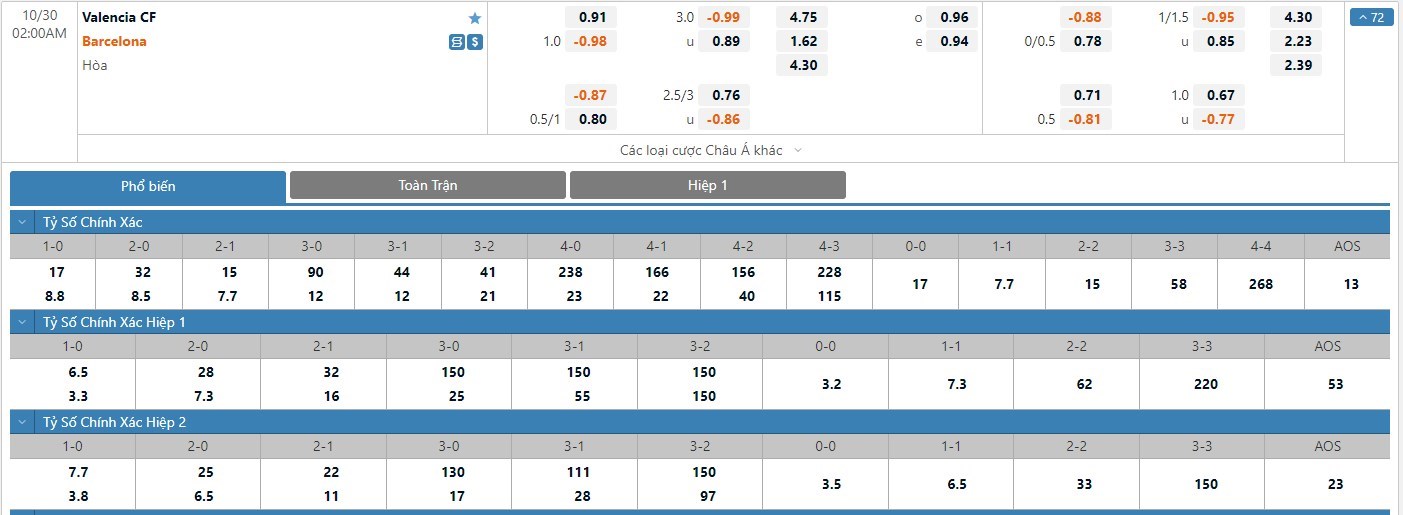 Tip kèo tỷ số hiệp 1: Valencia 0-1 Barcelona
