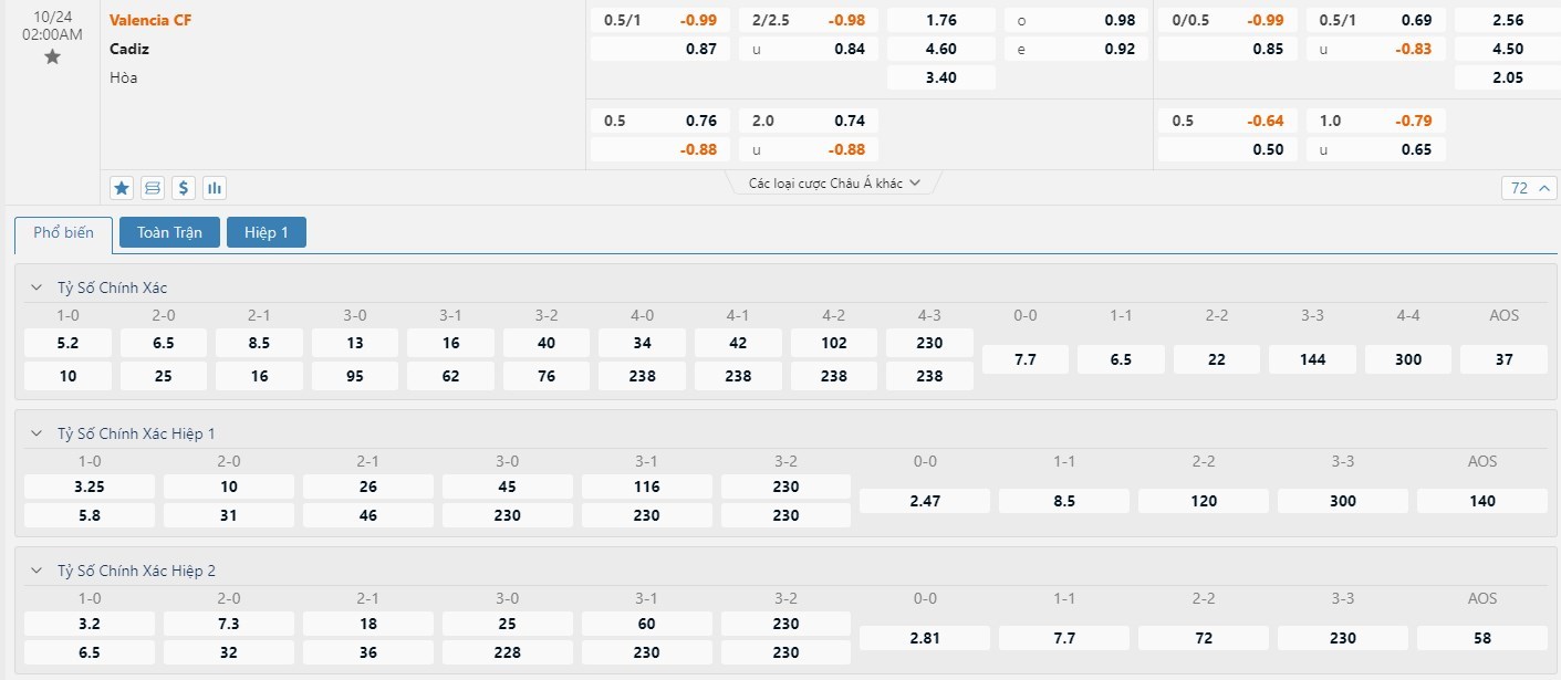 Tỷ lệ kèo ở cuộc đối đầu này là -3/4 trái nghiêng về Valencia và tỷ lệ này là không có gì quá đáng nói vào lúc này. Trong 5 lần gần nhất đối đầu nhau thì Valencia đang là đội thể hiện tốt hơn khi mang về 2 thắng lợi, còn lại là 2 trận hòa và 1 trận thua. Trên sân khách, Cadiz chỉ thắng 1 trận hiếm hoi trong 11 chuyến hành quân trở lại đây. Các nhà đầu tư nên tin tưởng vào đội chủ nhà ở trận này để mang về cơ hội thắng kèo cao hơn. Valencia chỉ giữ sạch lưới đúng 1 trận trong 7 trận đấu gần đây. Phía đối diện, Cadiz để thủng lưới ở 7/8 trận đấu vừa qua. Nhìn vào những thông số này thì người chơi có thể nghĩ tới kịch bản trận đấu sẽ xuất hiện nhiều bàn.