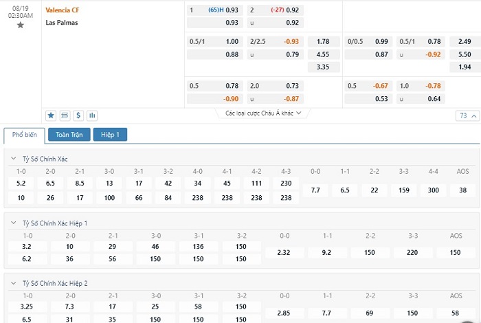 Tip kèo tỷ số hiệp 1: Valencia 1-0 Las Palmas