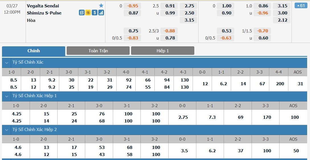 Tip kèo Châu Á hiệp 1: Chọn Vegalta Sendai +1/4