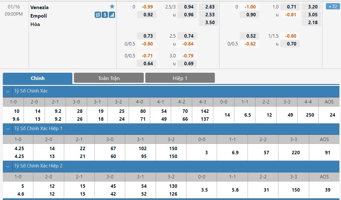 Tip kèo Châu Á hiệp 1: Chọn Venezia +1/4