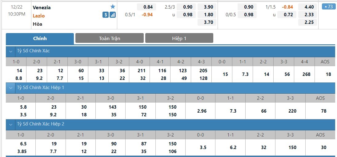 Tip kèo tỷ số hiệp 1: Venezia 0-1 Lazio