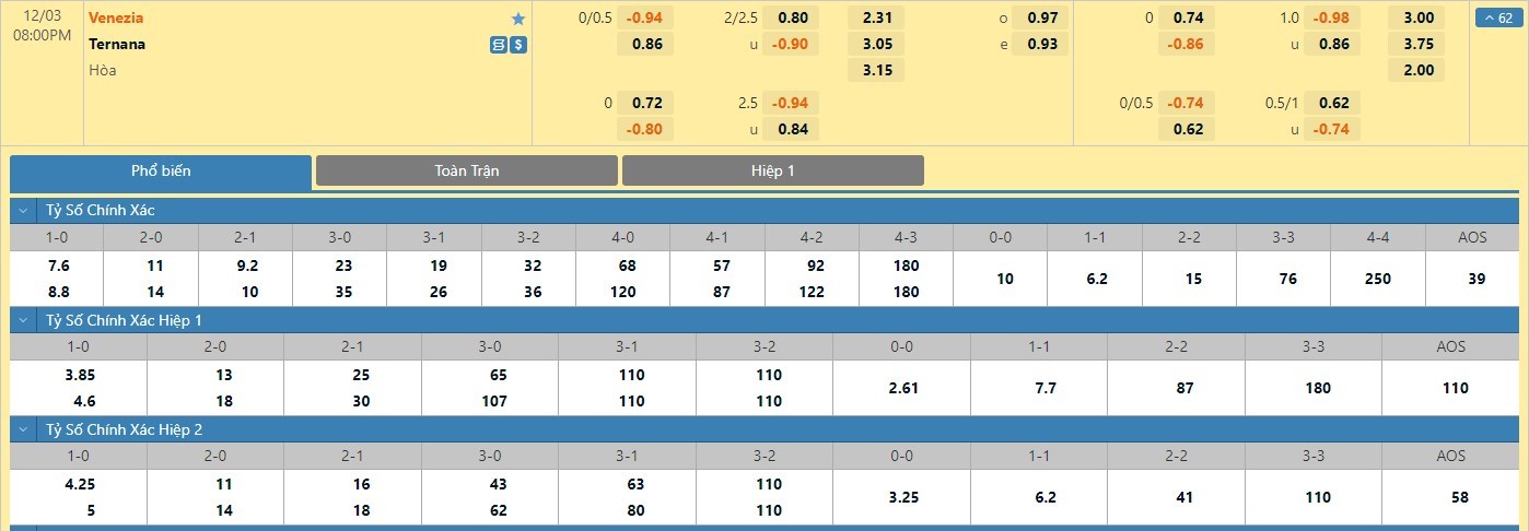 Tip kèo tỷ số hiệp 1: Venezia 1-0 Ternana