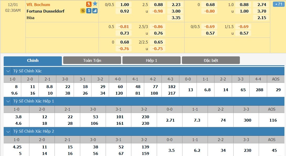 Tip kèo tỷ số hiệp 1: VfL Bochum 1-1 Fortuna Düsseldorf