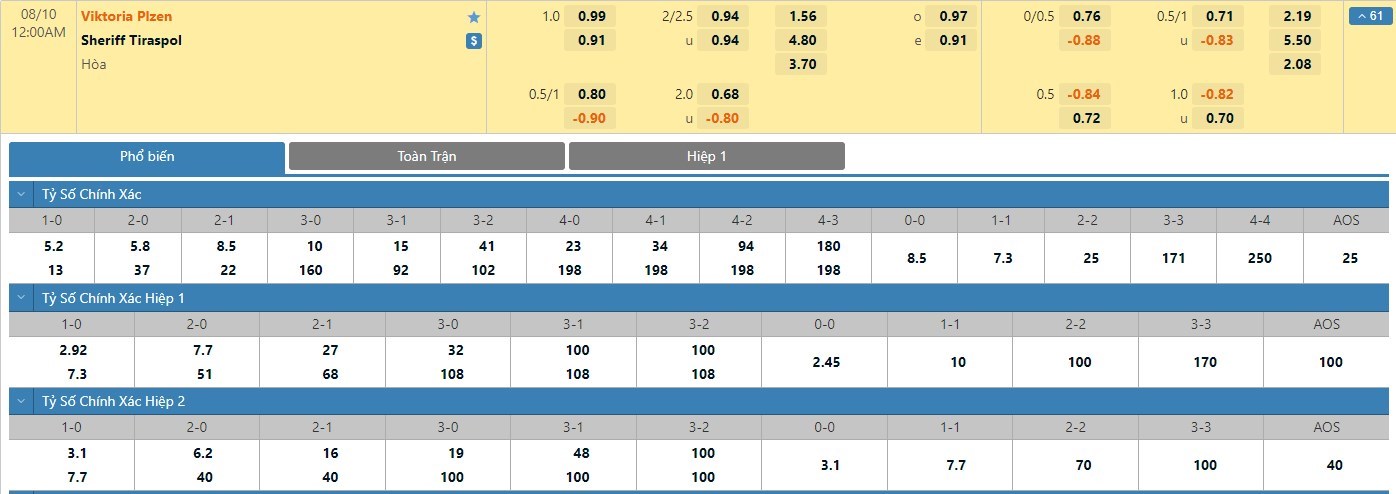Nếu như Viktoria Plzen đã có được cho mình 3/5 trận đấu gần nhất mang về 1 bàn thắng trong hiệp đấu đầu tiên thì Sheriff Tiraspol đã có 2 lần làm được điều này. Trong bối cảnh đang nắm lợi thế dẫn bàn thì Viktoria Plzen sẽ không cần thiết phải mạo hiểm chơi tấn công ở hiệp đấu đầu tiên. Với tỷ lệ kèo hiệp 1 là chủ nhà chấp -1/4 trái thì người chơi nên tin tưởng vào đội khách để mang về cơ hội thắng kèo cao hơn.
