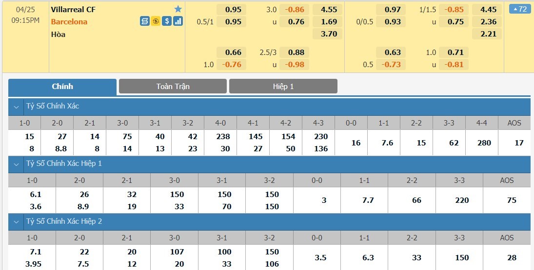 Tip kèo tỷ số hiệp 1: Villarreal 0-1 Barcelona