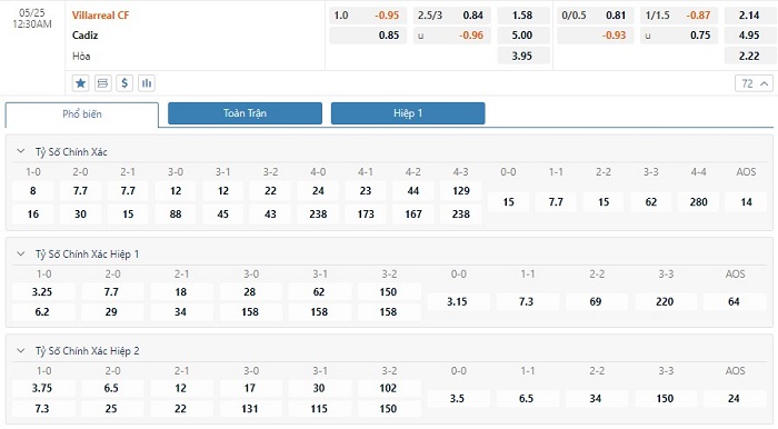 Tip kèo tỷ số hiệp 1: Villarreal 1-0 Cadiz