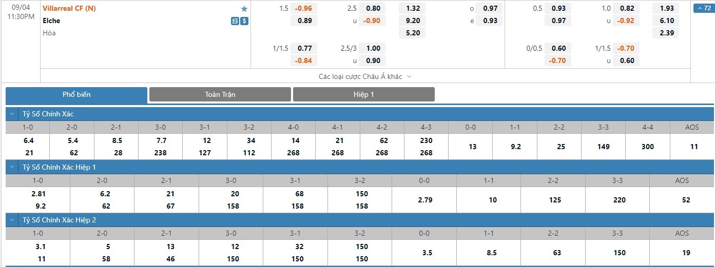 Tip kèo tỷ số hiệp 1: Villarreal 1-0 Elche