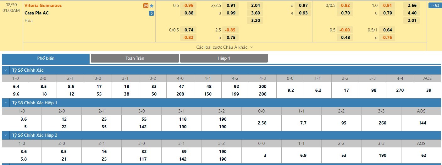 Tip kèo tỷ số hiệp 1: Vitoria de Guimaraes 1-0 Casa Pia